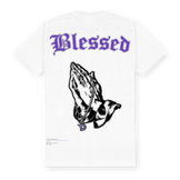 • Black base with purple “Blessed” gothic script and signature praying hands artwork — sleek, symbolic, and commanding.